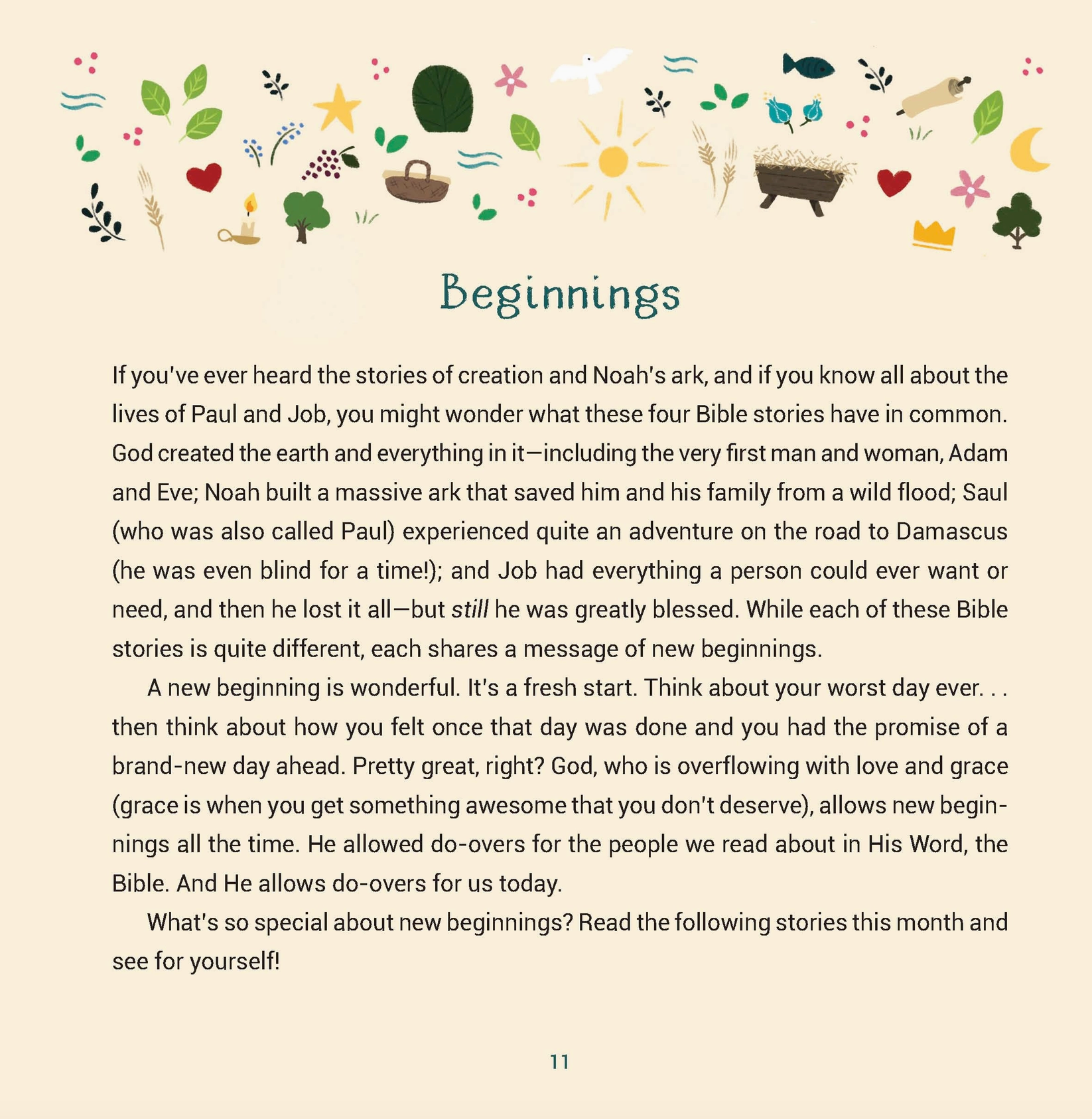 A Year of Bible Stories Is Sure to Become a Storytime Favorite in Your House! This lovely keepsake Bible storybook for kids celebrates each month of the calendar year with 48 best-loved stories from God's Word. The stories are arranged into monthly themes that relate to a specific month of the calendar year: JANUARY--BEGINNINGS FEBRUARY--LOVE MARCH--EASTER APRIL--SPRING MAY--CELEBRATION OF MOTHERS JUNE--CELEBRATION OF FATHERS JULY--FREEDOM! AUGUST--LEARNING AND WISDOM SEPTEMBER--STRENGTH AND PERSEVERANCE OCTOBER--HARVEST NOVEMBER--THANKSGIVING DECEMBER--CHRISTMAS Each section includes 4 colorfully illustrated Bible stories that reinforce the monthly theme and show kids how God worked in the lives of Bible men and women--and how He works in the lives of people today! A fun bonus section at the end of the book features a list of yearly calendar celebrations with dates and brief explanations.