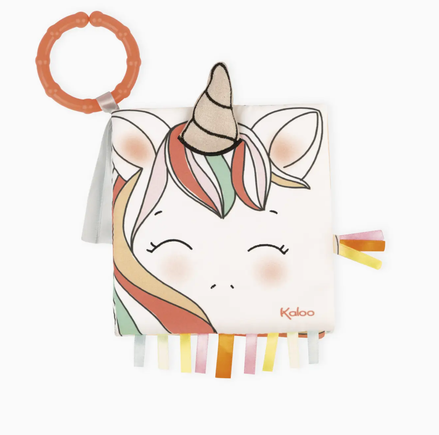 Take a journey to the heart of your emotions thanks to these very sweet books from Kaloo. Each 5.5 inch soft book has beautiful illustrations to look at, a story to tell, fabrics to stroke and amusing activities to stimulate baby’s senses so you can spend tender moments together. Discover the story of a pretty little unicorn who goes looking for the sun and wants to play with it. Enjoyment, play and delight: this is the recipe the book provides for happiness. Includes: a clip-on lamb and ribbons to grab!