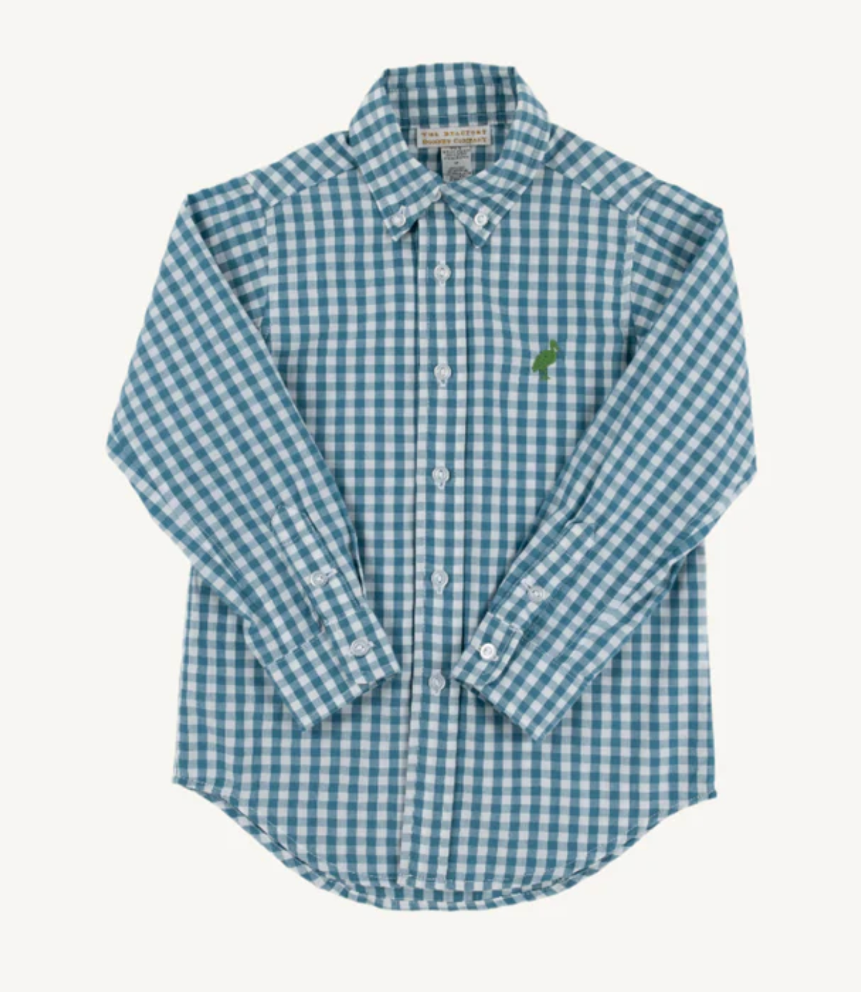 Your dapper little gent is sure to look perfectly put together in our Dean's List Dress Shirt featuring Barnsley Blue Gingham with Gallatin Green Stork! The perfect addition to any little gent's fall wardrobe!