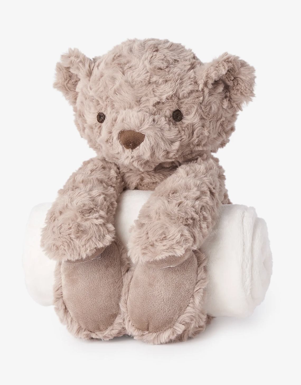 - 100% Polyester plush stuffed animal holding a 30" x 40" flannel fleece baby blanket