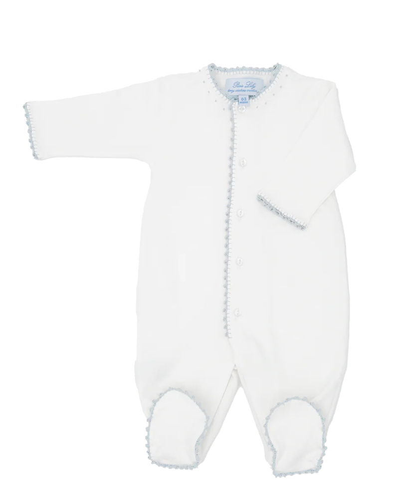 Whether it's January or July, a footy romper is a necessity for baby's wardrobe. Our footy romper is made from cozy Pima cotton jersey and buttons down the front, with has snaps at the legs for convenient diaper changing. It is trimmed in cotton crochet and has dainty french knots embroidered at the neck.