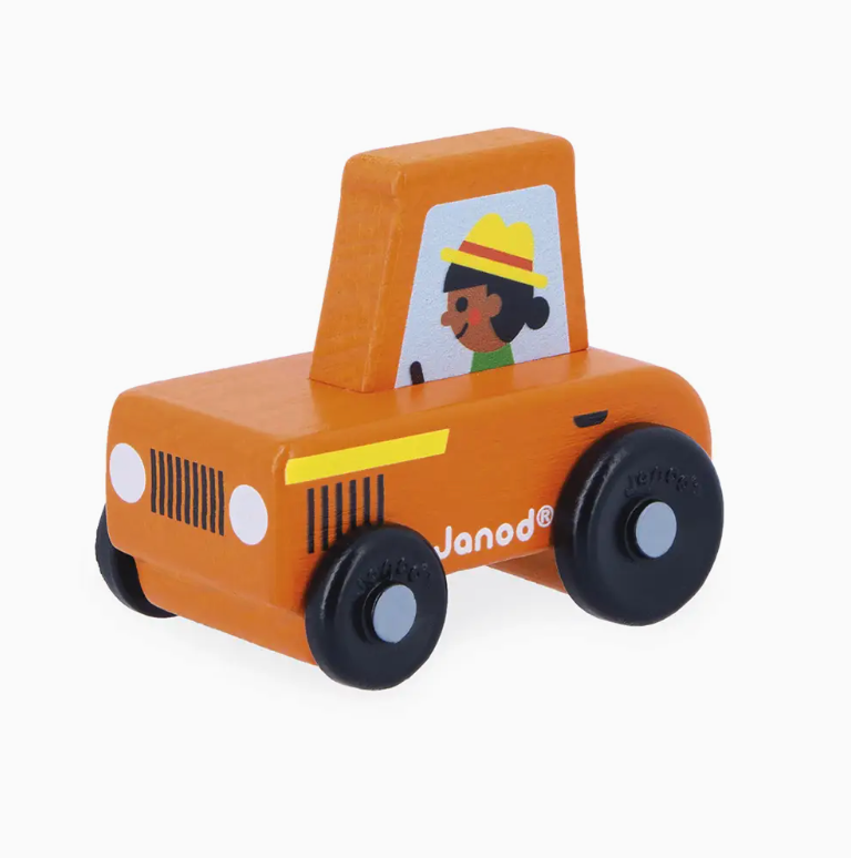 Climb aboard the tractor so we can transfer the cows to the meadow! Invent great farmyard stories with this wooden tractor. Thanks to its shape, the tractor can easily be grasped by little ones. Toy for children aged 12 months and up. Combine this push-along car with its mat and cool block set in the same Janod range to perfectly complete the universe.
