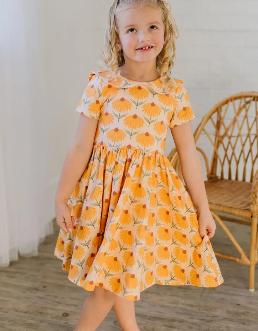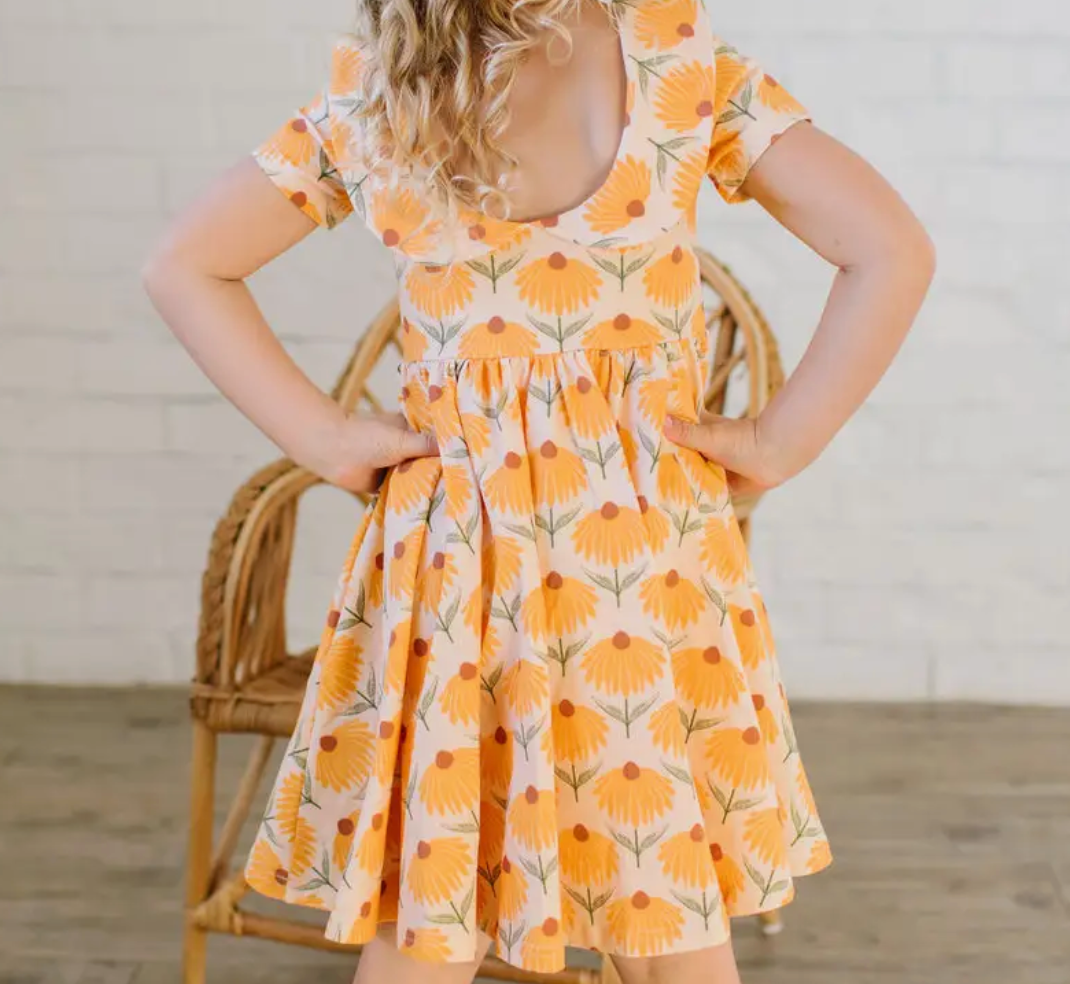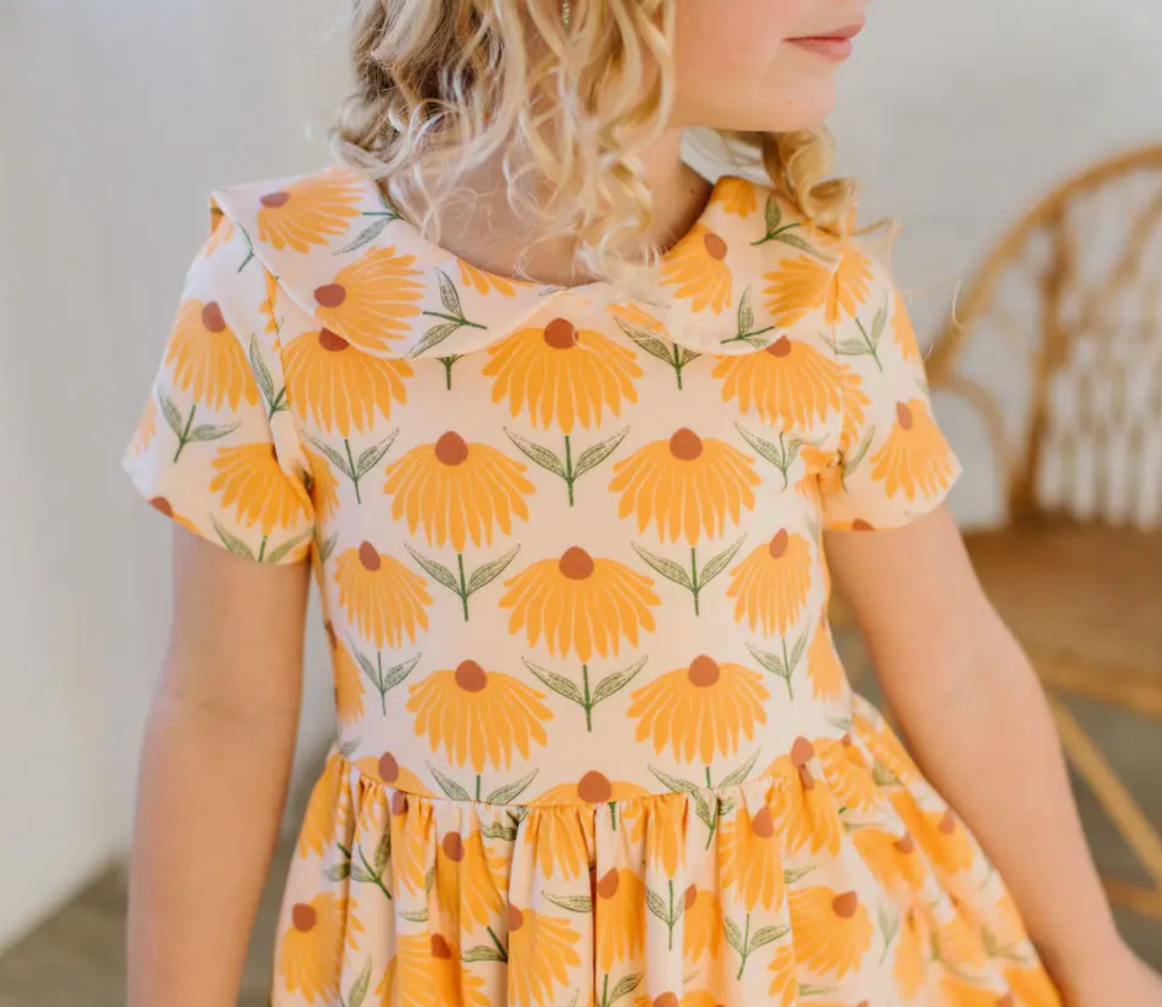 Our Elizabeth Twirl Dress features a timeless, sweet silhouette with a wrap-around collared scoop back, a lined bodice for comfort, and hidden inseam pockets to keep little treasures close. The full circle skirt is designed for the best twirls, perfect for playtime all day long. Crafted from a soft and stretchy blend of 95% premium jersey cotton and 5% spandex, this dress offers cozy comfort and durability — ideal for your little one’s everyday adventures. Wrap-around collared scoop back for a classic touch Lined bodice and hidden inseam pockets Full circle skirt for twirling fun Soft, breathable, and stretchy fabric
