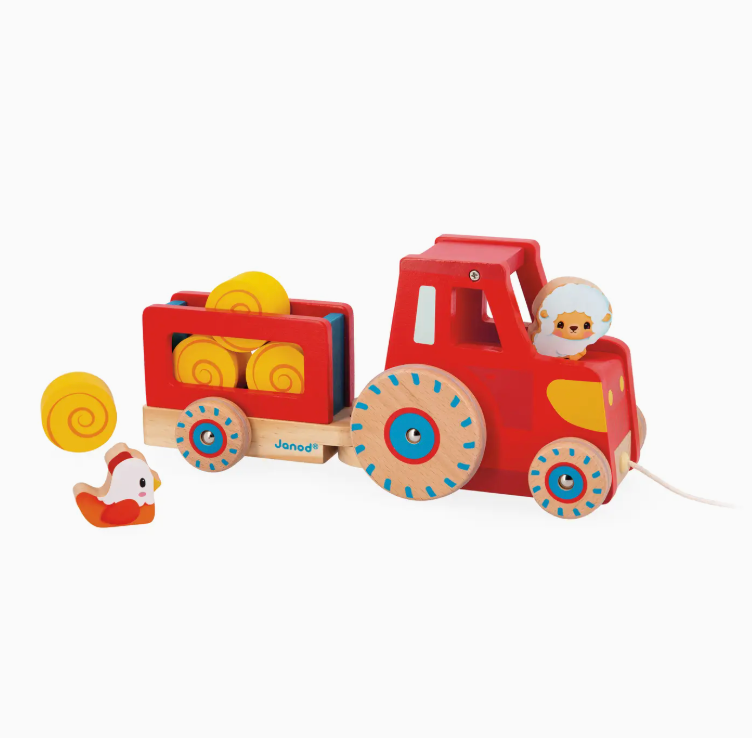 Vroom, vroom! Watch out for the tractor! It’s carrying all the bales of straw! But where is it going? The tractor is heading to the field to feed the patiently waiting sheep and hens. This adorable wooden tractor consists of a removable trailer, 4 bales of hay, a hen and a sheep. Thanks to its pull-along string, this tractor will be a great walking aid for little ones. Furthermore, its silicone wheels mean it can be pulled silently around the house without marking the surfaces. Pull-along early-learning toy for children aged 12 months and up.