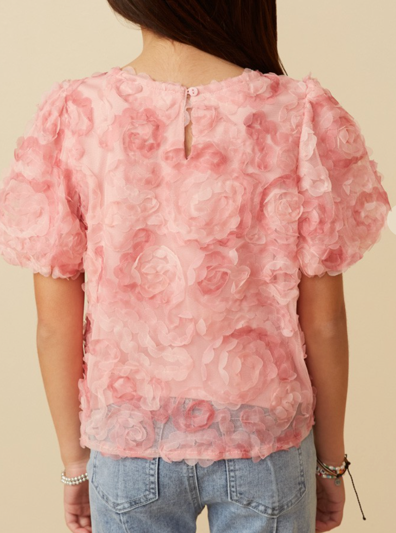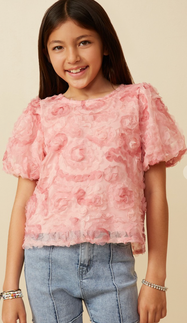 Girls Floral Textured Puff Sleeve Organza Top *Floral Textured Fabric *Puff Sleeves *Top Lining