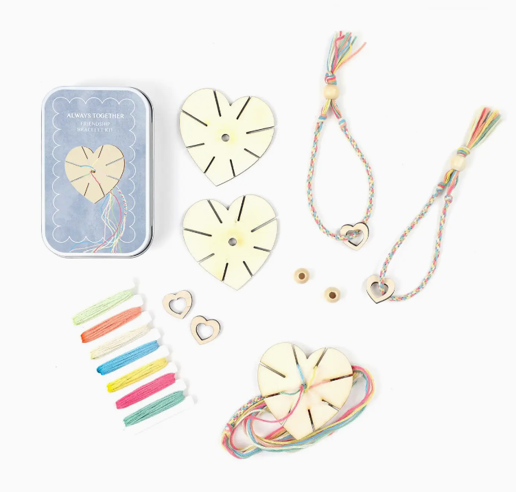 • Recommended for ages 5+ • Plastic free • Promotes fine motor skills • Perfect for till point add-ons • All materials provided • Ideal for party favours & stocking fillers • UKCA/UKNI/CE tested & FSC certified This kit is designed to connect you with a wonderful friend, regardless of whether you’re physically together or apart. Be it mother and daughter, sisters, or two best friends, the components for our Always Together kit cater for two, & can be sized accordingly. Construct the two bracelets using the wooden heart shaped bracelet tools, the colourful threads & heart charms. Two tools are included in each kit so that the bracelets can be made in unison. MATERIALS: pastel coloured threads, 2 wooden spherical beads, 2 cherry wood heart cut outs, 2 x wooden heart shaped bracelet tools DIMENSIONS: each kit comes in a gift tin measuring 96 X 59 X 21mm
