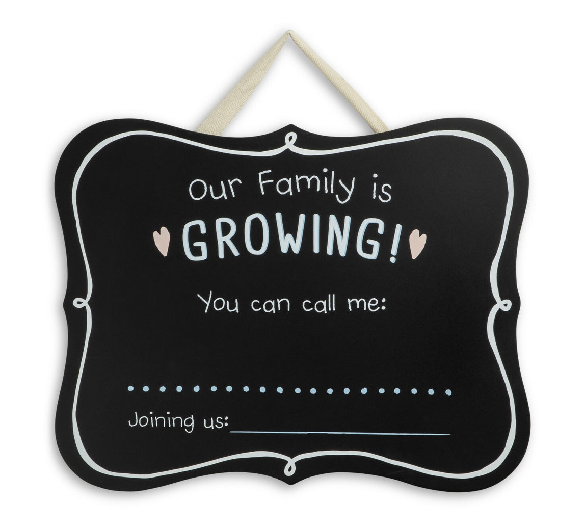 A fun way to announce happy news! The 17"w x 13"h Growing Family Sign is a great decoration for celebrating milestones. A unique new baby gift for a baby shower.