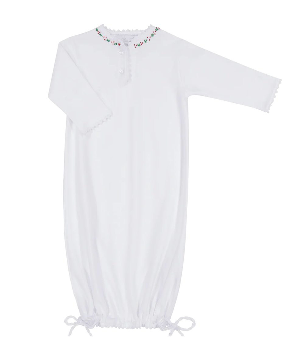 Our classic newborn sack is embroidered with delicate holly sprigs. Coordinating holly cap and blanket available but also coordinates with white trimmed blanket and cap.
