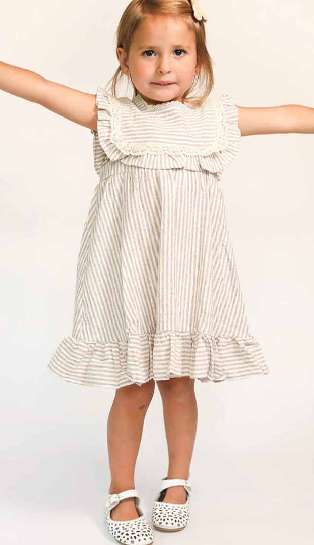 Meet Ivy! Our striped linen-cotton blend dress, adorned with delicate lace trim, is poised to be a seasonal favorite. Comfy, classic, and charming – it has everything you and your little one could want!