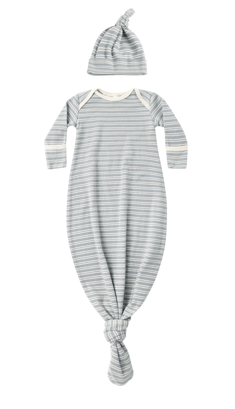 KNOTTED BABY GOWN + HAT SET || STEEL BLUE MICRO STRIPE
