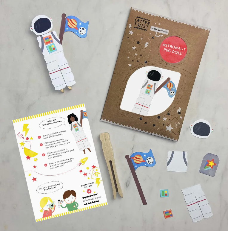 • Recommended for ages 3+ • Sustainable eco-friendly materials • Promotes fine motor skills • Perfect for till point add-ons • All materials provided • Ideal for party favours & stocking fillers • UKCA/UKNI/CE tested & FSC certified Children love to craft & create, & this astronaut peg doll is no exception. Not only a fun activity, this peg doll also sparks imaginative play. The astronaut comes with trousers, top, helmet, control panels & a backpack, together with a choice of skin tones & hairstyles for further personalisation. Cotton Twist products are lovingly assembled by hand, & all components are as good as we can possibly make them. MATERIAL - cardboard cut outs, wooden peg doll, glue dots DIMENSIONS - each pack comes with a recyclable kraft envelope measuring 16.5cm by 11.5cm together with an A6 printed instruction card