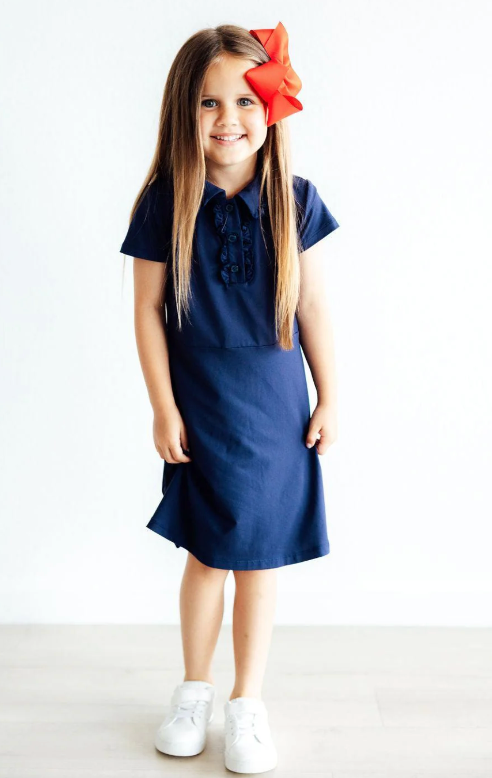 Classic meets cute in this girls' polo dress, the perfect blend of sporty style and sweet charm. Made from buttery-soft fabric, this short-sleeve dress is designed to keep up with busy days—whether she’s headed to school, running around the playground, or dressing up for a family outing.