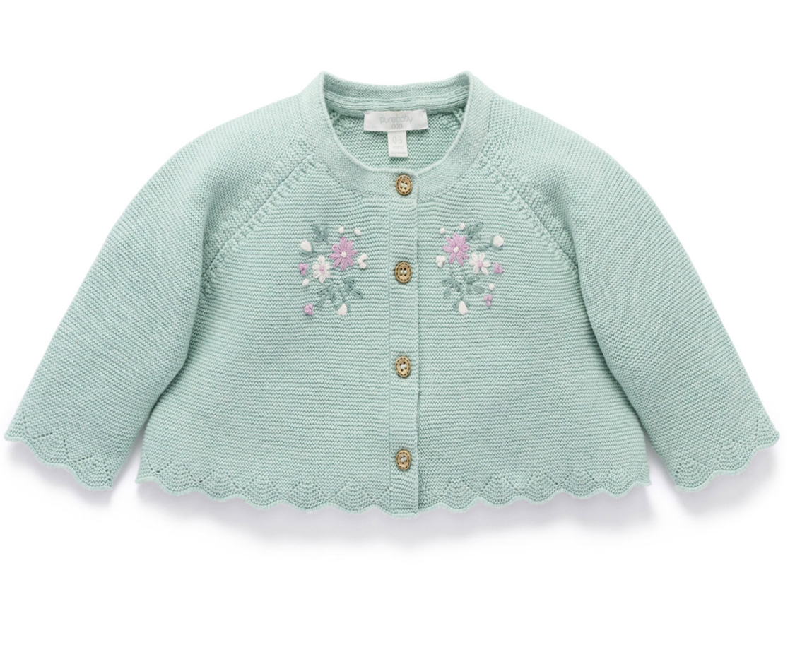 Our Hand Embroidered Cardigan is the sweetest layering piece to add to her winter wardrobe. Featuring a pretty hand embroidered floral detail, with wood look buttons and a scalloped hem. Made from our soft organic cotton and wool blend yarn. Layer over a dress or romper for a sweet outfit. Hand embroidered floral detail Perfect for layering Scalloped hem Wood look buttons down the front Made from 92% Organic Cotton/8% Wool