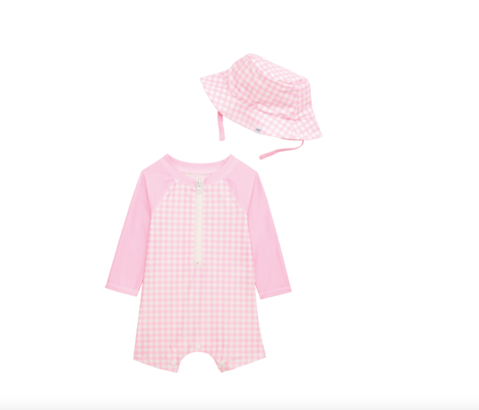 This adorable Gingham Baby Rash Guard Set is perfect for keeping your little one stylish and protected during sunny days. The 2-piece set includes a charming nylon spandex one-piece rash guard that features a convenient neckline zipper for easy dressing and inner leg snaps for quick diaper changes. The set is completed with a coordinating bucket hat, providing extra sun protection and a cute, coordinated look. Designed with UPF 50+ fabric, this set ensures your baby is shielded from harmful UV rays while enjoying outdoor activities. Available in size 3-6 months, the rash guard is crafted from a soft and stretchy blend of 82% polyester and 18% spandex, offering comfort and flexibility for your baby's movements. Ideal for beach outings, pool days, or any sunny adventure, this set combines functionality with adorable style.