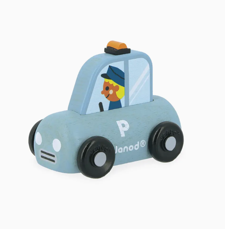 Let’ go on lots of exciting missions aboard the police car! Toddlers can invent countless stories with this wooden car. The car can easily be grasped by little ones. Toy for children aged 12 months and up. Combine this push-along car with its mat and cool block set in the same Janod range to perfectly complete the universe.