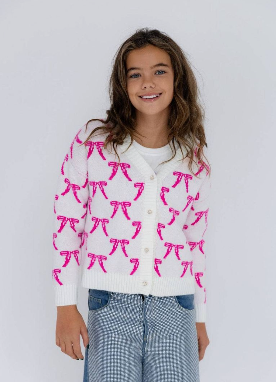 - Adorned with an all-over pink bow pattern, adding a charm to any outfit. Soft, warm knit fabric ideal for chilly days and layering