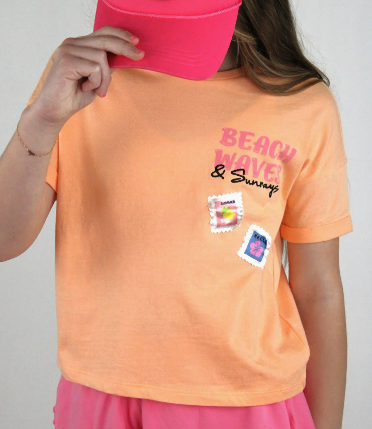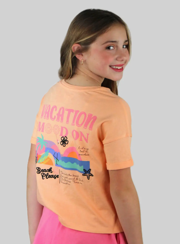 Tween cotton shirt with the phrase 'beach waves' and '& sunrays' embroidery details, adorned with satin appliques on the front. The back features the phrase 'Vacation mood on' surrounded by a graphic and summer phrases.