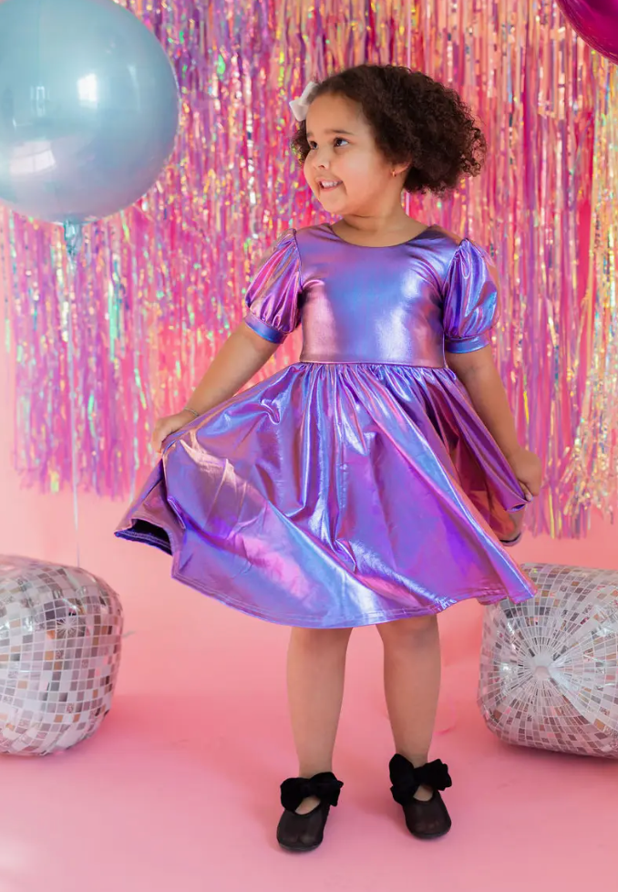Get the party started with our Puff Dress in Lamé! This show-stopping dress features a fun short puffy sleeve, a flattering scoop back, and a full skirt designed for maximum twirl power. Crafted from a shimmering purple lamé fabric, it shines bright at every occasion. The crew neck and comfortable elastic waist ensure a perfect fit for all-day wear. Shimmery purple lamé fabric that dazzles Short puffy sleeves for playful charm Scoop back for a stylish touch Full skirt with elastic waist for twirling fun Care Instructions: Spot Clean with gentle soap Lay flat to dry to maintain shimmer and shape. Avoid ironing directly on lamé fabric.