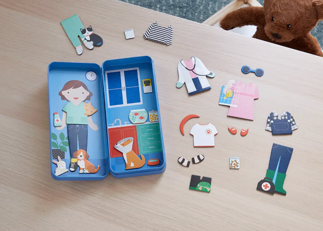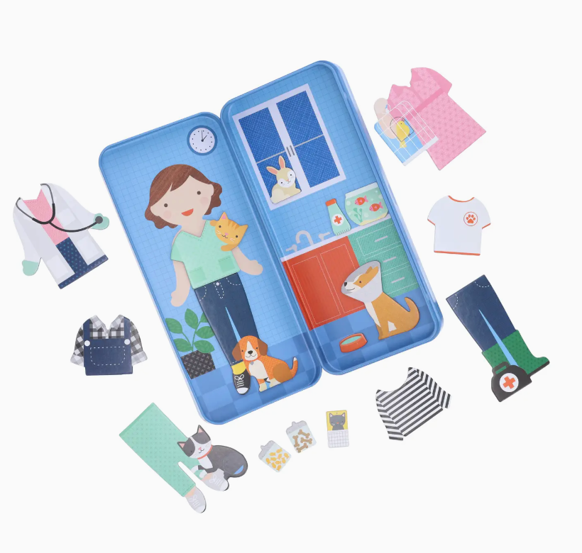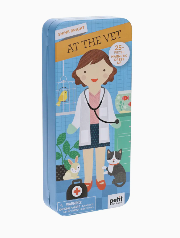 Curious, caring, kind. Inspire your little animal lover to become a veterinarian with this At The Vet Shine Bright Magnetic Play Set from Petit Collage. Featuring 2 scenes and 29 magnetic pieces in a portable tin, this set is designed for hours of imaginative play, whether at home or on-the-go. Perfect for ages 3+, our Shine Bright Magnetic Play Sets are designed to encourage children to dream big and shine bright!
