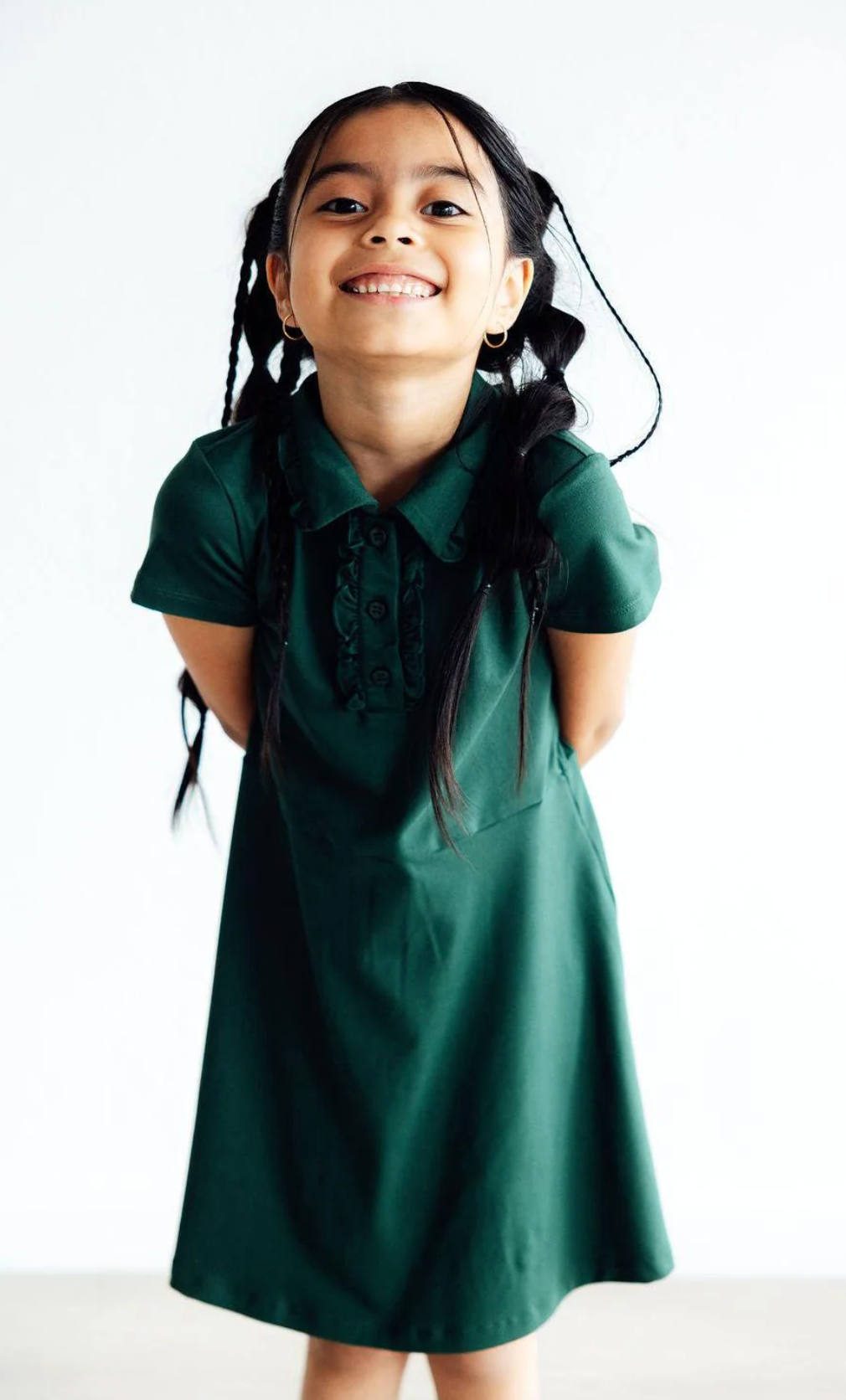 Classic meets cute in this girls' polo dress, the perfect blend of sporty style and sweet charm. Made from buttery-soft fabric, this short-sleeve dress is designed to keep up with busy days—whether she’s headed to school, running around the playground, or dressing up for a family outing.