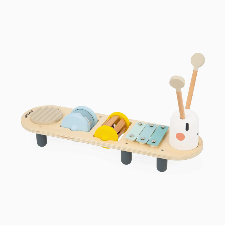 Do Re Mi….this is a particularly fun caterpillar! Let your child experiment and discover each part of this musical caterpillar’s body. This musical stand has 5 instruments. The head is a maracas that doubles as storage for the beaters. On its back you will find a xylophone and a scratcher in soft colors, as well as 2 removable rattles. The first has 3 bells and the second is a rain stick. Your child can spin them on the base or shake them up and down. This musical stand is ideal for helping your child discover and experiment with different sounds in order to develop their hearing acuity. Wooden musical toy. For children aged 18 months and over.