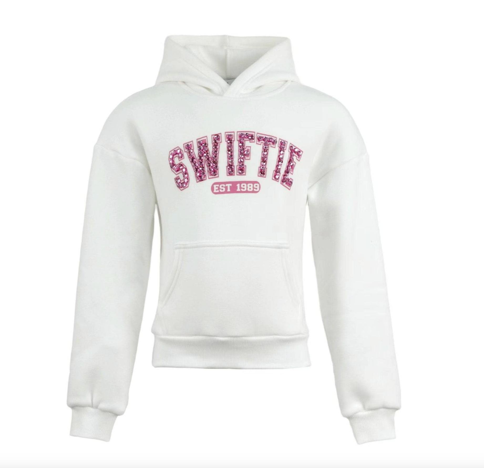 - Show your Swiftie pride with this chic hoodie, featuring bold pink sequined "Swiftie" lettering and "EST 1989" detail.