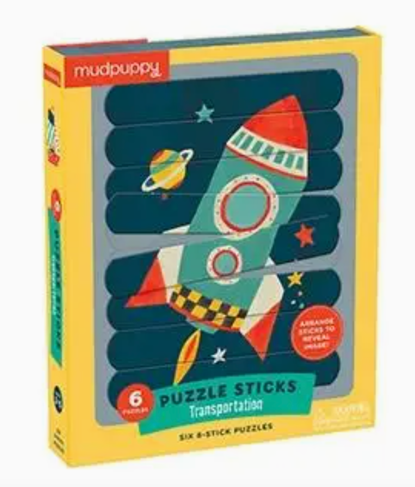 Mudpuppy's Transportation Puzzle Sticks consist of 24 double sided pieces that create six different eight-piece puzzles! Sort the sticks and place them in the puzzle tray to reveal six different types of transportation, from cars to planes. -24 double-sided puzzle pieces -creates 6 puzzles, 8 pieces each -puzzle tray included -drawer box, 7.5 x 9.25 x 1.4 -Ages 3+