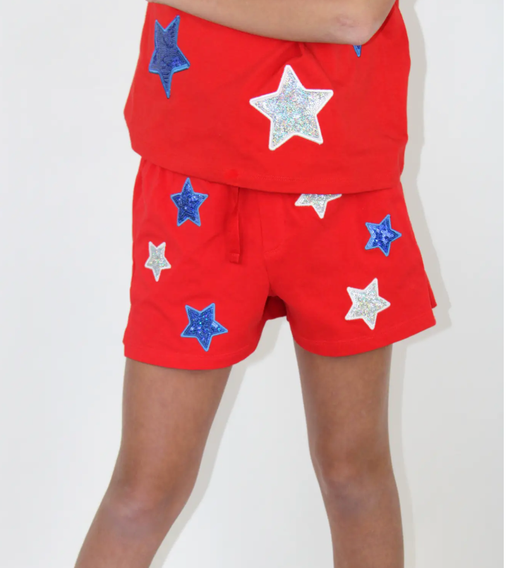 Tween cotton spandex short adorned with multiple white and blue sequins stars.