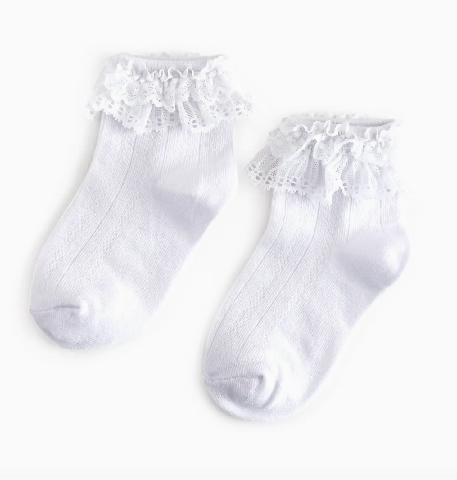 Lace Bobby Socks in White Machine wash cold with like colors. Tumble dry low or lay flat to dry. 79% cotton / 19% polyester / 2% spandex