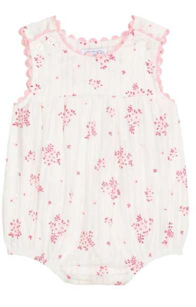 White woven dobby gauze sleeveless bubble features ric-rac neckline and sleeve trim. Inner leg snaps.