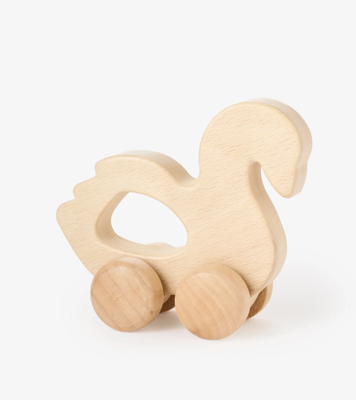 This adorable swan features soft colors and easy-rolling wheels, perfect for little hands to push and pull. A delightful blend of fun and function, it encourages motor skill development and imaginative play, making it a perfect gift for any nursery or playroom. A beautiful keepsake for years to come.